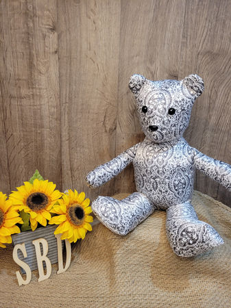 This version of the memory bear includes the original shirt/clothing item only. Special items can be added, such as a bow around the neck or ear, a bow-tie, or flower/bow on ear. Other options available upon request.